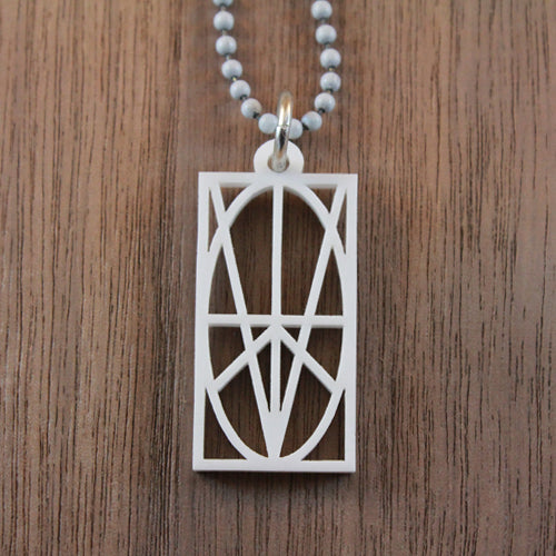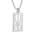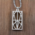Pendant measures 1-3/8" x 5/8". Comes on a 30" black ball chain with a connector clasp that can be cut to desired length.