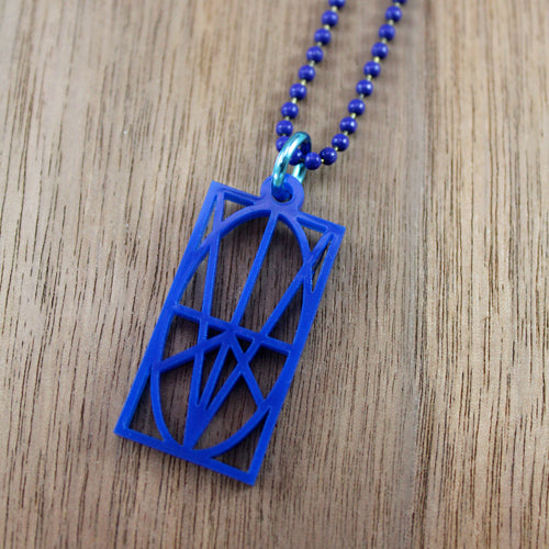 Pendant measures 1-3/8" x 5/8". Comes on a 30" blue ball chain with a connector clasp that can be cut to desired length.