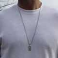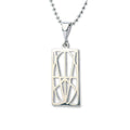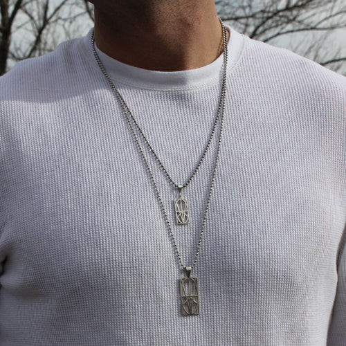 Pendant measures 7/8" x 1/2". Comes on a 30' sterling plated ball chain with lobster clasp