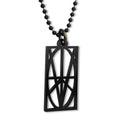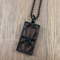 Pendant measures 1-3/8" x 5/8". Comes on a 30" black ball chain with a connector clasp that can be cut to desired length.