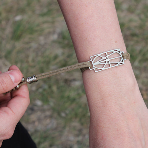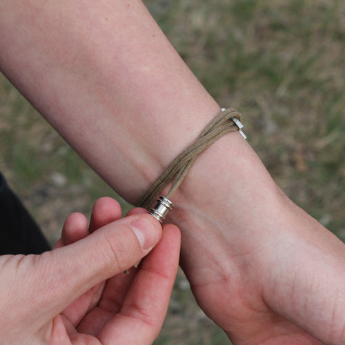 Pewter Wrap & Tuck's are a versatile, everyday bracelet that can be worn at the gym or out on the town. This adjustable bracelet is comprised of pewter with a stylish & durable cotton cord. Plus, it's the easiest bracelet you'll ever put on. Follow the 3 steps below. Wrap cord more or less, depending on your wrist size. We offer Large and Small Wrap & Tuck bracelets, which refers to the size of the Zymbol, not the size of the bracelet. Take a look at the images above to see a comparison picture.