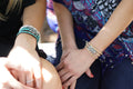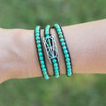 This Zymbol multi-wrap bracelet makes for the perfect accessory to achieve a fun look. Turquoise colored beads are hand-woven on dark brown leather.